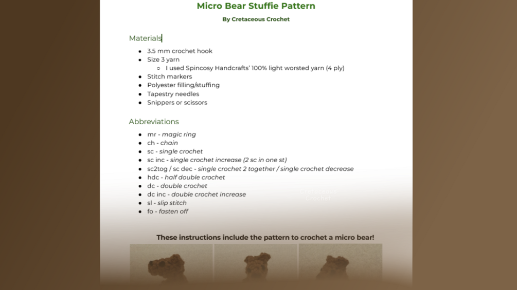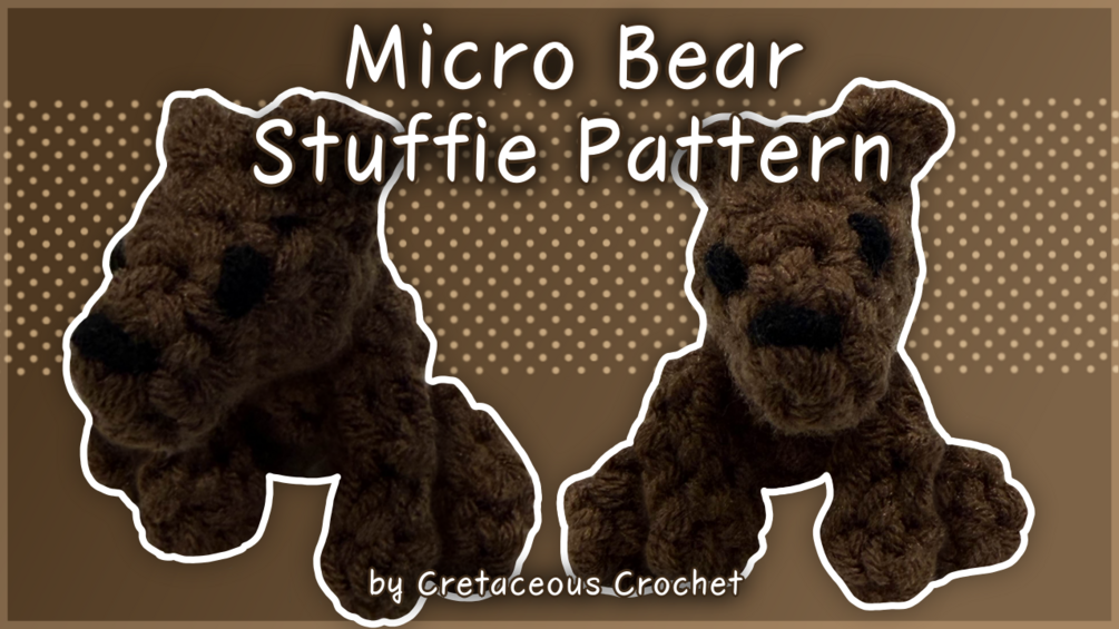 Create a micro crochet bear with this 4-page pattern! Designed for crocheters who enjoy working small, this pattern results in a delicate, bite-sized plush that’s perfect for displays, key chains, or collectible projects. Due to its size, it's a satisfying challenge for confident beginners and experienced crocheters alike. This micro plush measures about 3 inches tall and takes roughly 3 hours to complete.